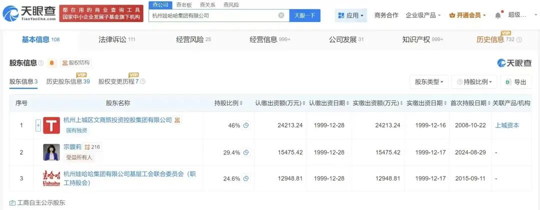 据悉,娃哈哈商标不属于宗馥莉一个人。工商登记信息发现,娃哈哈股权呈现出三方制衡的格局:杭州市上城区文商旅投资控股集团有限公司(国资)持股46%。宗馥莉继承宗庆后,个人持股29.4%。基层工会(职工持股会)持有24.6%。