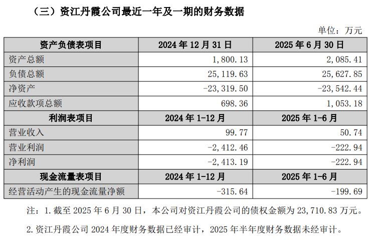 读创财经注意到,资江丹霞公司财务数据方面 ,上表显示,截至2025年6月30日,公司净资产为-2.35亿元;2025年上半年,资江丹霞公司营收为近51万元,净利润为-223万元。桂林旅游此次拟清仓转让该公司,可能有“甩包袱”的考虑。