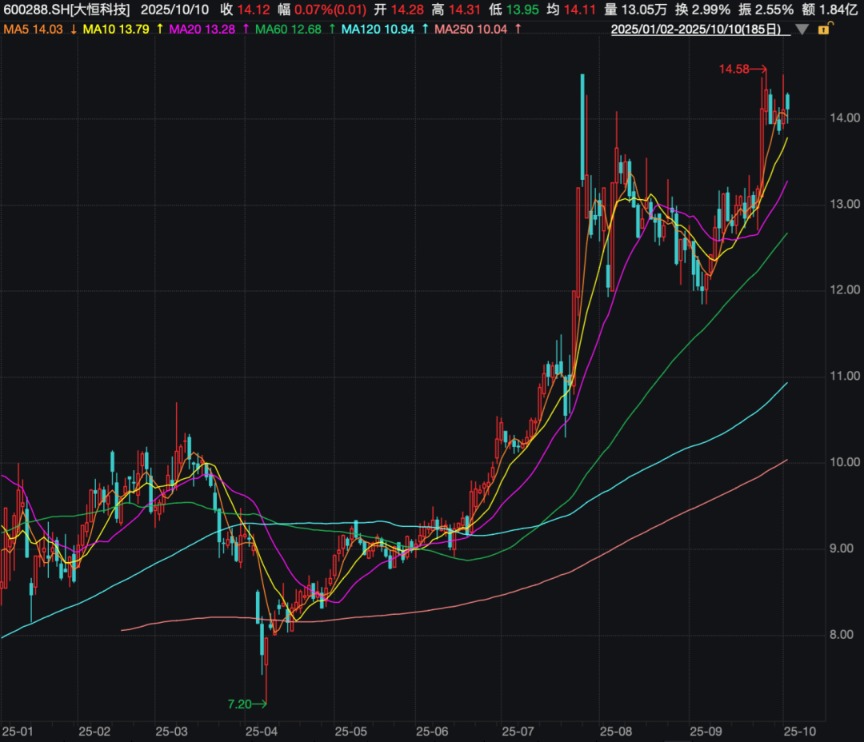 从股价表现来看,在今年8月初拍卖结果公布后,大恒科技股价单日下跌8.71%,但后一日又涨停,9月以来该股迎来一波上涨。截至10月10日,大恒科技报收于14.12元/股,今年以来涨幅达到65.34%,最新总市值为62亿元。