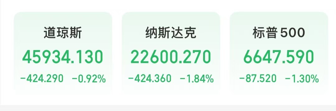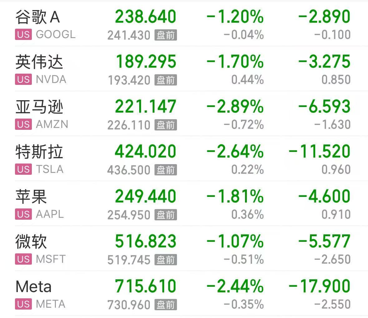大型科技股普跌,亚马逊、特斯拉、Meta跌超2%,谷歌、英伟达、苹果、微软跌超1%。