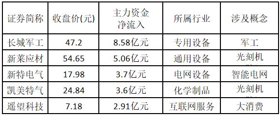 从主力资金来看,今日涨停板个股中,主力资金净流入金额排名前5的个股分别为长城军工、新莱应材、新特电气、凯美特气、遥望科技。