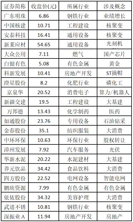 涨停板个股中,股价创出近一年新高的个股有22只(不包括创出历史新高的个股),包括广东明珠、中国核建、安泰科技、新莱应材、大众公用、白银有色、科新发展、澄星股份、京泉华、新疆交建、万邦德、如通股份、金春股份、中环环保、漳州发展、华新水泥、养元饮品、四方股份、鹏欣资源、依依股份、武进不锈、深振业A,具体如下表所示。