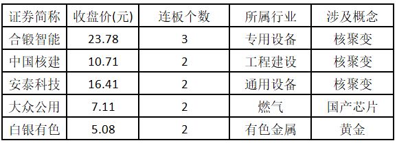 从连板情况来看,今日首板个股有46只;2连板的个股有9只;3连板及以上的个股有1只。今日连板数排名前5的个股包括合锻智能、中国核建、安泰科技、大众公用、白银有色,具体如下表所示。