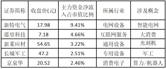 主力资金净流入金额占市值比例排名前5的个股分别为新特电气、遥望科技、新莱应材、长城军工、京泉华。