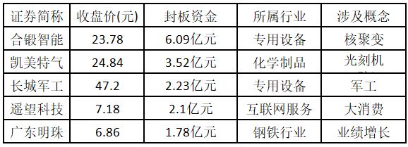 从封板资金来看,今日涨停板个股中,封板资金排名前5的个股包括合锻智能、凯美特气、长城军工、遥望科技、广东明珠。