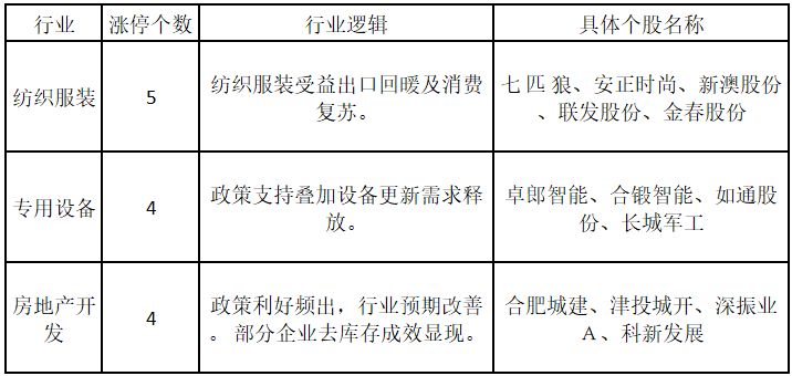 从行业特征来看,今日涨停板个股中,纺织服装、专用设备、房地产开发行业的个股最多。