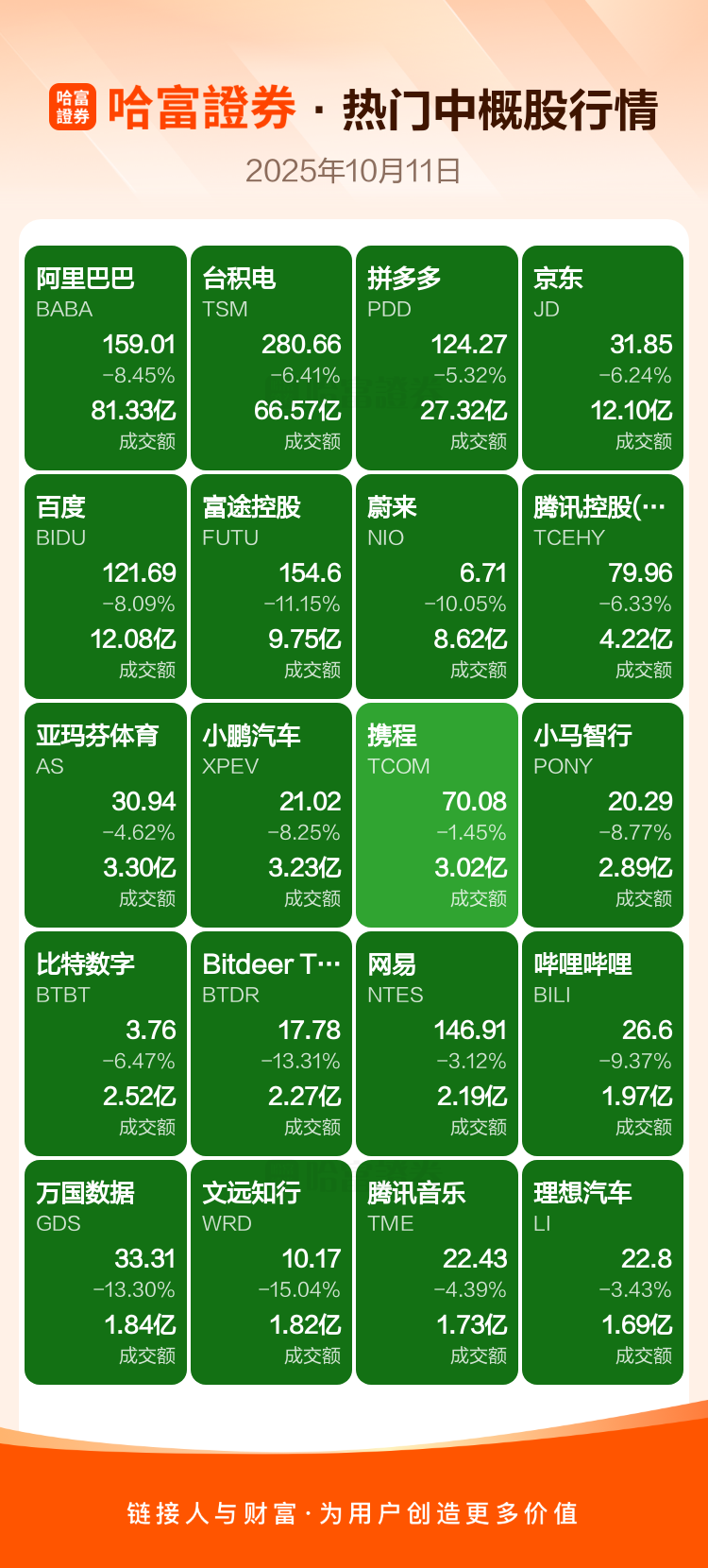阿里巴巴跌8.45%,台积电跌6.41%,拼多多跌5.32%,京东跌6.24%,百度跌8.09%,富途控股跌11.15%,蔚来跌10.05%,腾讯控股(ADR)跌6.33%,亚玛芬体育跌4.62%,小鹏汽车跌8.25%。