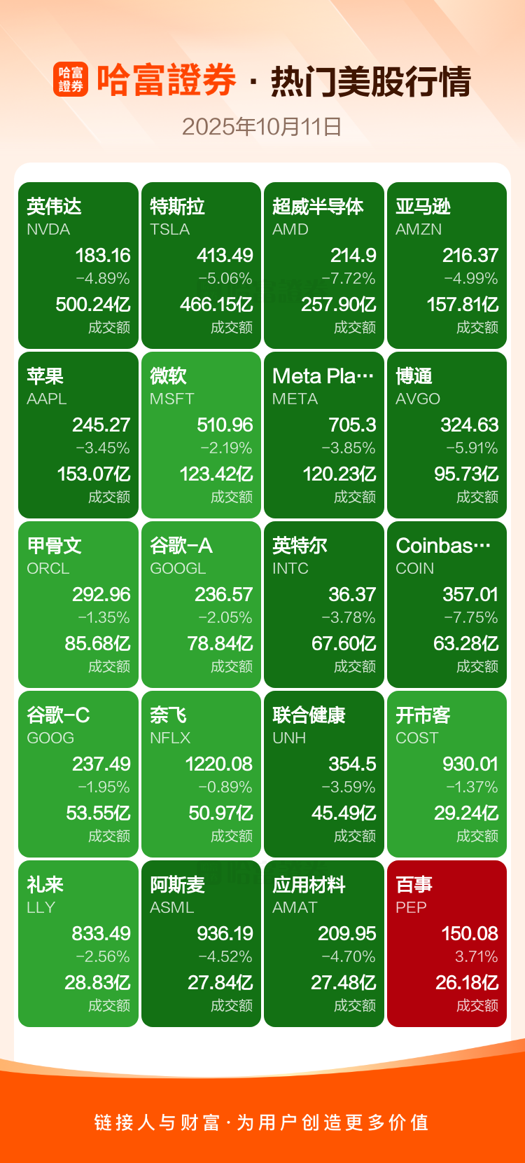 英伟达跌4.89%,特斯拉跌5.06%,超威半导体跌7.72%,亚马逊跌4.99%,苹果跌3.45%,微软跌2.19%,Meta Platforms Inc-A跌3.85%,博通跌5.91%,甲骨文跌1.35%,谷歌-A跌2.05%。