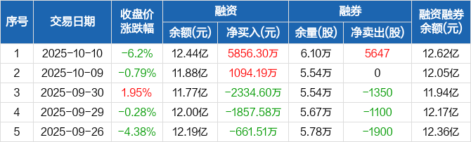 融资方面,当日融资买入1.93亿元,融资偿还1.34亿元,融资净买入5856.3万元。融券方面,融券卖出6447股,融券偿还800股,融券余量6.1万股,融券余额1742.3万元。融资融券余额合计12.62亿元。
