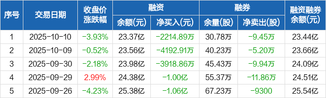 融资方面,当日融资买入1.35亿元,融资偿还1.57亿元,融资净偿还2214.89万元,连续7日净偿还累计3.92亿元。融券方面,融券卖出100股,融券偿还9.46万股,融券余量30.78万股,融券余额684.86万元。融资融券余额合计23.44亿元。