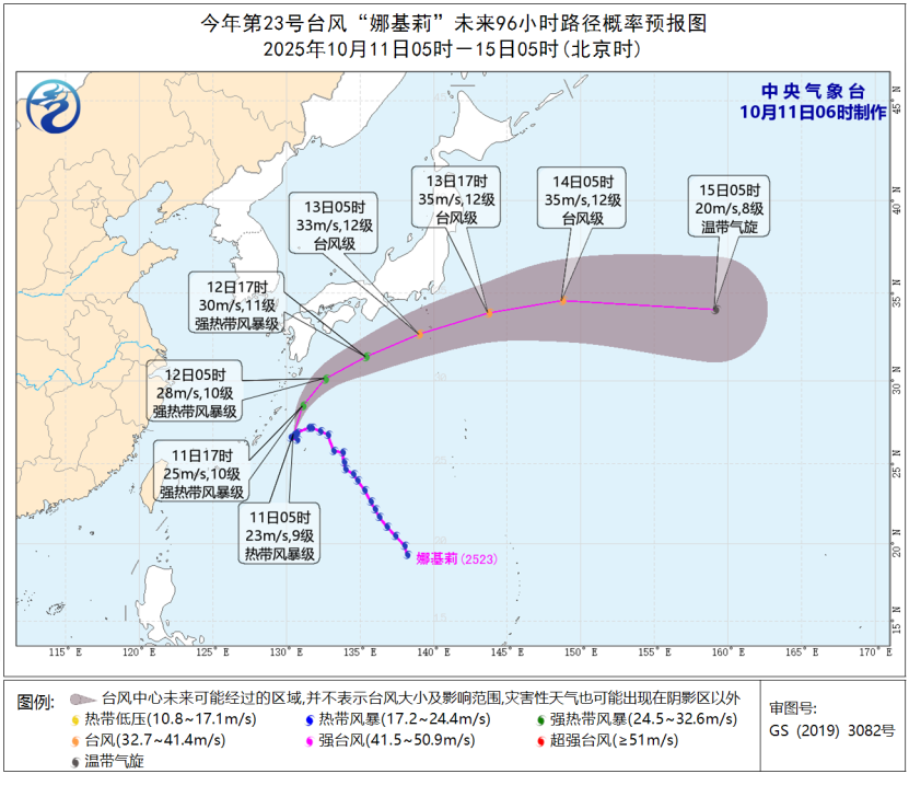 预计,“娜基莉”将以每小时15-20公里的速度向北偏东方向移动,向日本以南洋面靠近, 强度缓慢加强。受其影响,11日白天至夜间,东海东部偏东的部分海域有6-8级大风,阵风9-11级。