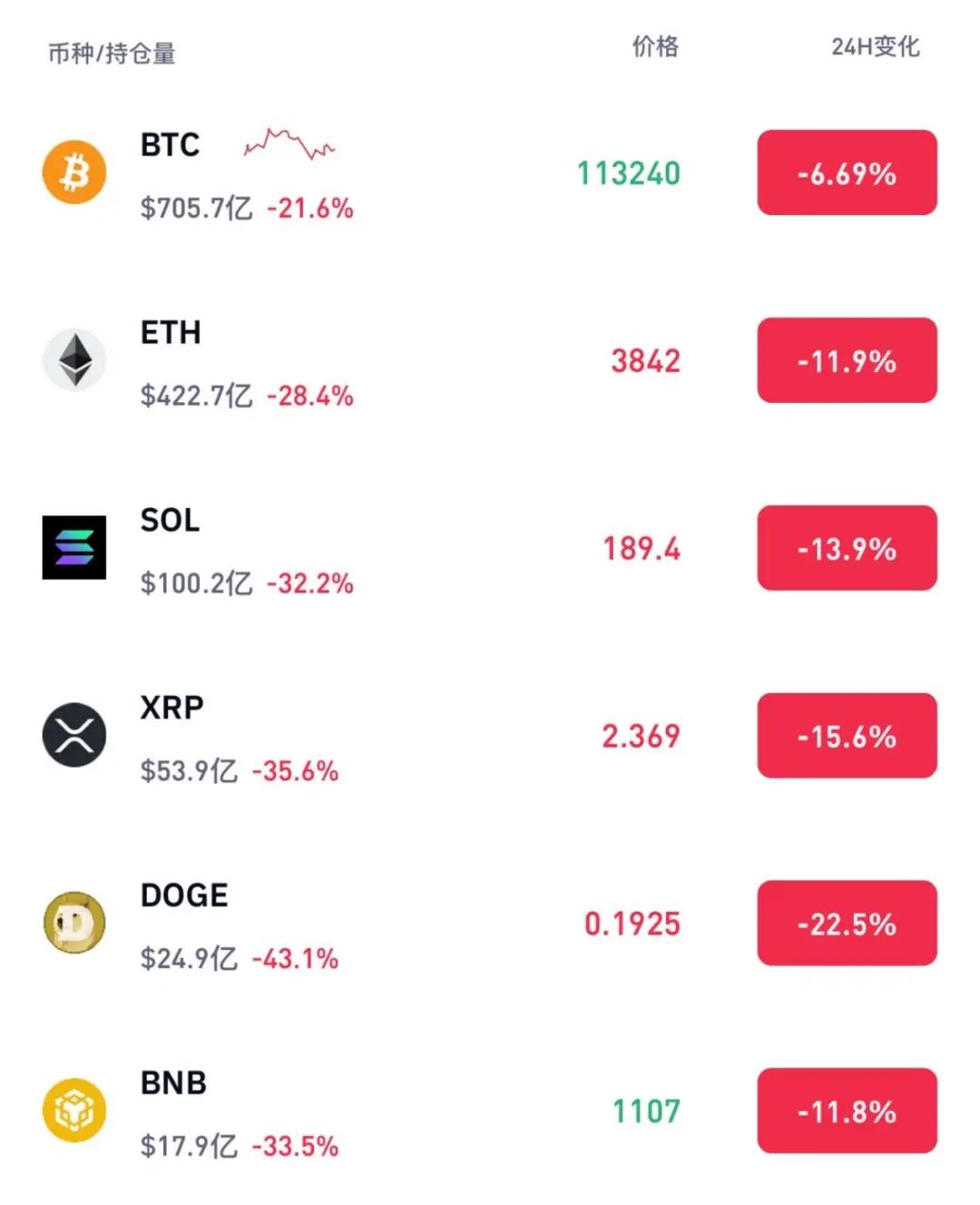 此外,狗狗币、BNB、SOL等均跌超10%。