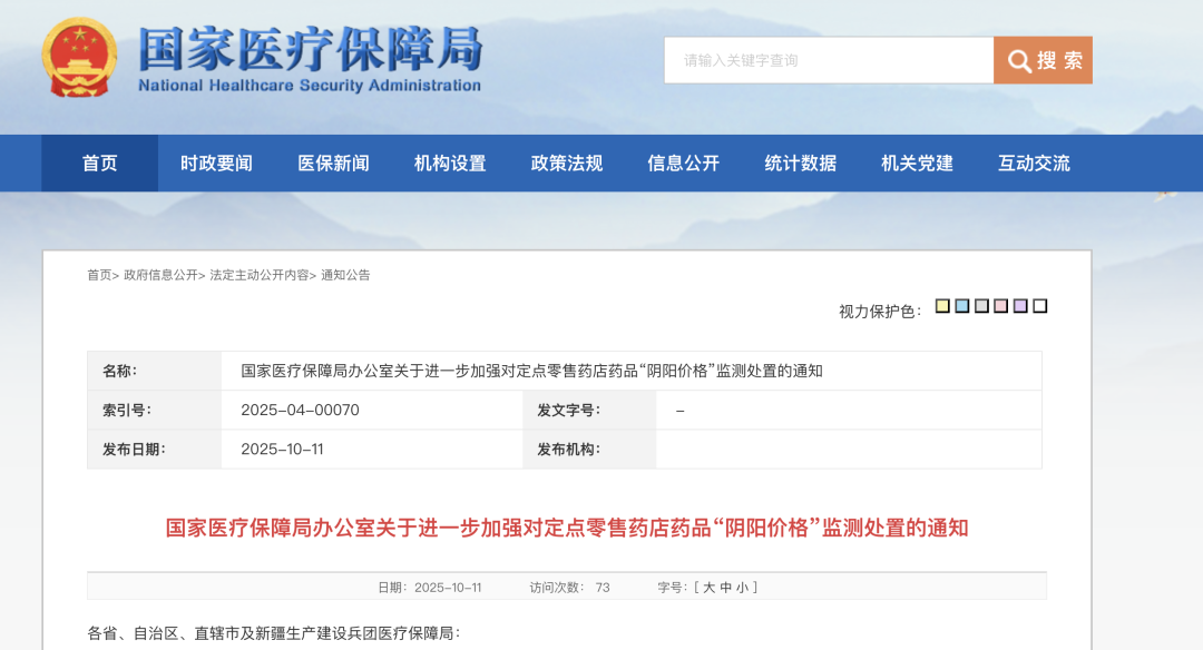 10月11日,国家医疗保障局办公室发布《关于进一步加强对定点零售药店药品“阴阳价格”监测处置的通知》指出,近期,部分地区陆续发现定点零售药店(下称“定点药店”)对医保非医保患者采用“阴阳价格”(歧视性价格)行为,即完全相同的药品销售给医保患者的价格高于非参保患者。依据《中华人民共和国价格法》《中华人民共和国药品管理法》等法律要求,定点药店通过向参保患者高价售药牟利行为涉嫌价格欺诈,同时违背了定点药店医保服务协议中“不得对医保参保人员实行不公平、歧视性价格”的管理要求,应予严肃核查处置。
