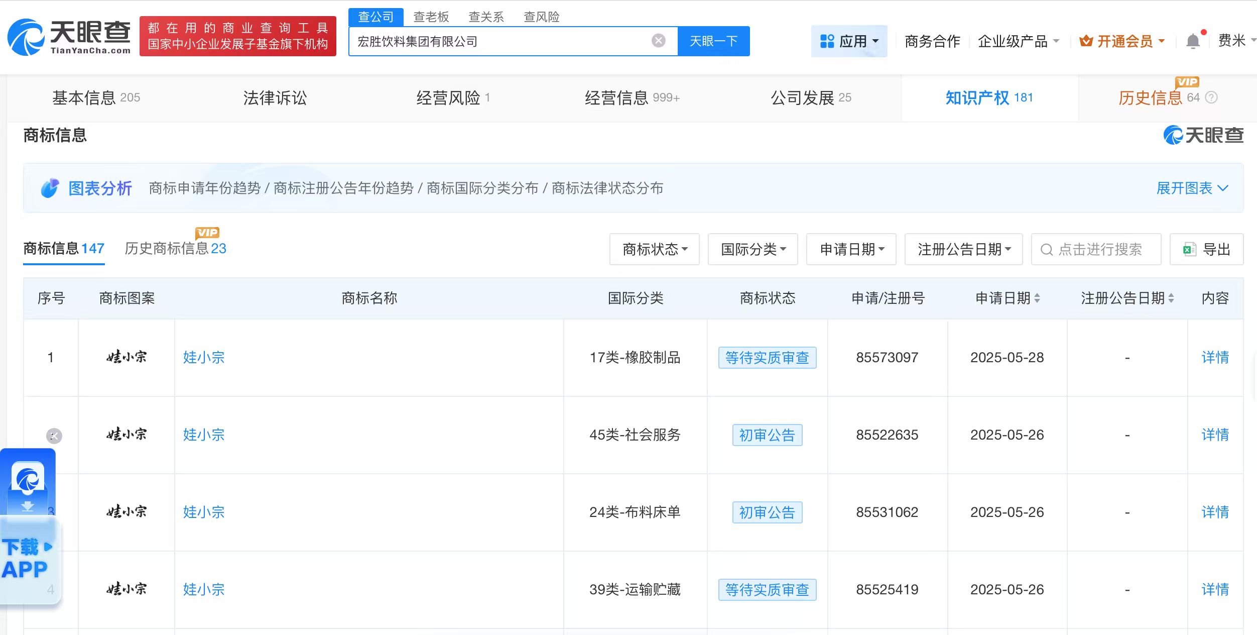 宏胜饮料集团今年已申请多枚“娃小宗”商标