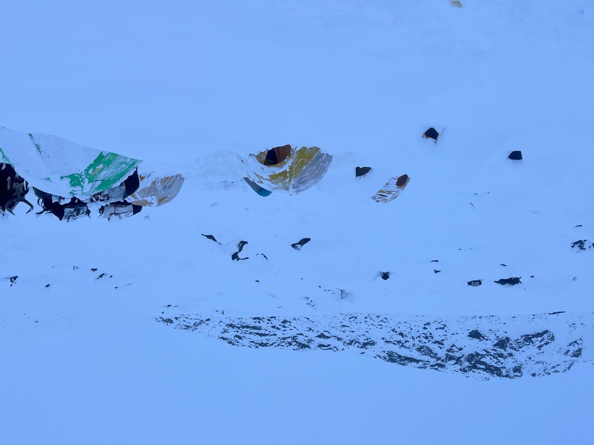 在安荣下了一个很大的流石坡,又上了一个很大的坡后,山里又开始下雪,而且还刮着大风。安荣说:“从这个时候开始,雪就基本没停过了。”这个时候是4号下午两三点钟左右,安荣与其他领队当即意识到这场雪不会小了。