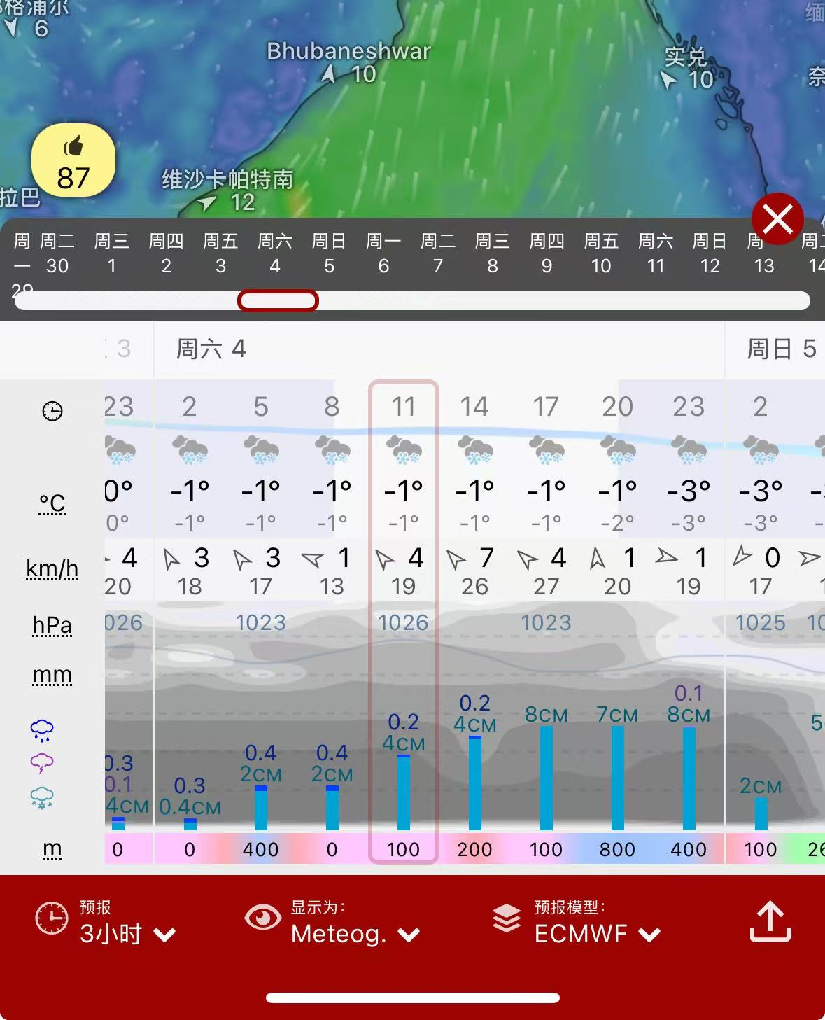 立夏在行前至少三四天做的天气预测。预测显示雪量最高会出现在4号早上5点以后,每小时8cm的降雪量。 图/受访者立夏提供
