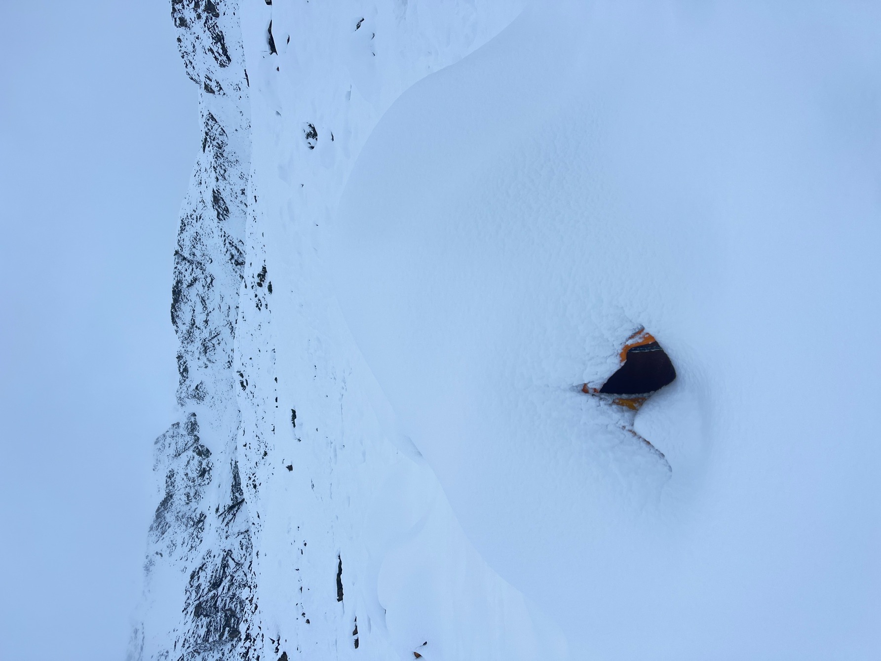 暴雪后的帐篷基本已被掩埋。“我拍了几张照片基本是看不出来它是帐篷的,你只能看到一个小雪包在那。”安荣说。 图/受访者安荣同学提供