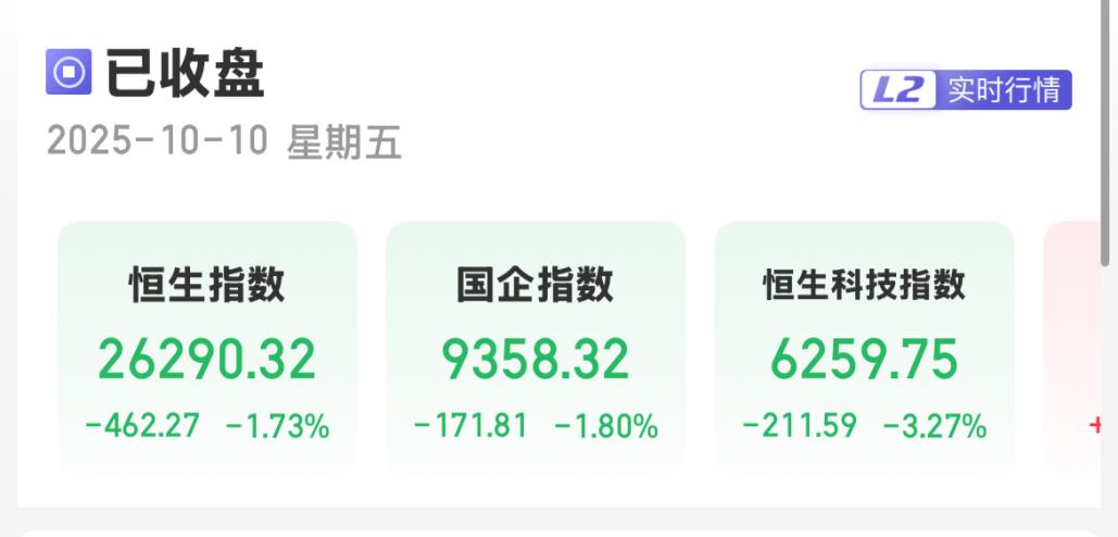 10月10日,港股三大指数震荡走跌。截至收盘,恒生指数跌1.73%,报26290.32点;恒生国企指数跌1.80%,报9358.32点;恒生科技指数跌3.27%,报6259.75点。