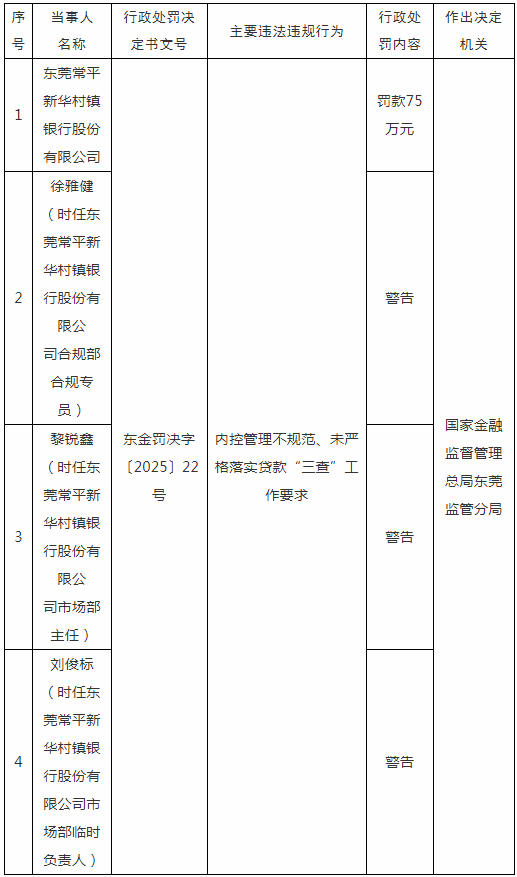 同时,徐雅健(时任东莞常平新华村镇银行股份有限公司合规部合规专员)、黎锐鑫(时任东莞常平新华村镇银行股份有限公司市场部主任)、刘俊标(时任东莞常平新华村镇银行股份有限公司市场部临时负责人)被警告。