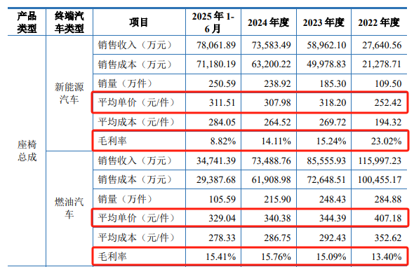 报告期各期,公司新能源座椅的平均单价分别为252.42元/件、318.20元/件、307.98元/件和311.51元/件,价格波动显著;同时,其毛利率依次为23.02%、15.24%、14.11%和8.82%,呈现出明显的下降趋势。