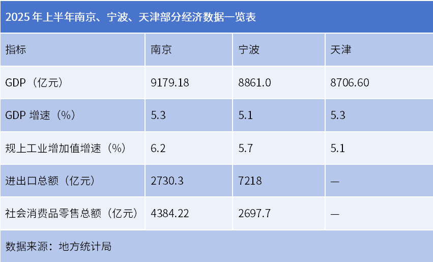 但南京这个对手却不能小觑。2024年末,南京GDP为1.85万亿元,宁波为1.81万亿元,两者差353亿元,2025年一季度,这个差距缩小到298亿元,上半年结束之时,差距却又来到318.18亿元。