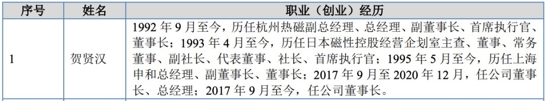 中欣晶圆披露,1992年9月至今,贺贤汉历任杭州热磁副总经理、总经理、副董事长、首席执行官、董事长;1993年4月至今,历任日本磁性控股经营企划室主查、董事、常务董事、副社长、代表董事、社长、首席执行官;1995年5月至今,历任上海申和总经理、副董事长、董事长;2017年9月至2020年12月,任公司董事长、总经理;2017年9月至今,任公司董事长。