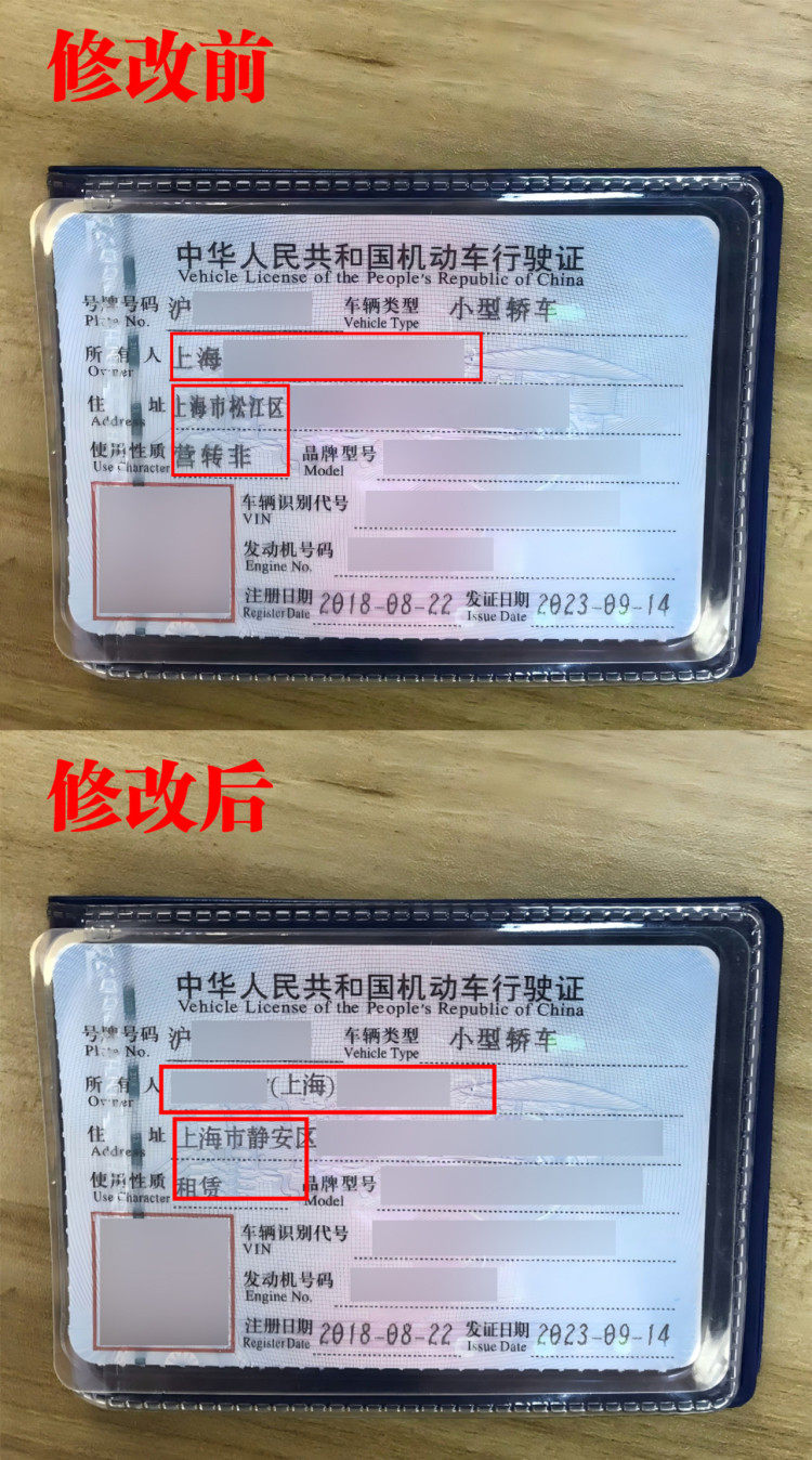 修改前后的行驶证。图片来源/上海警方