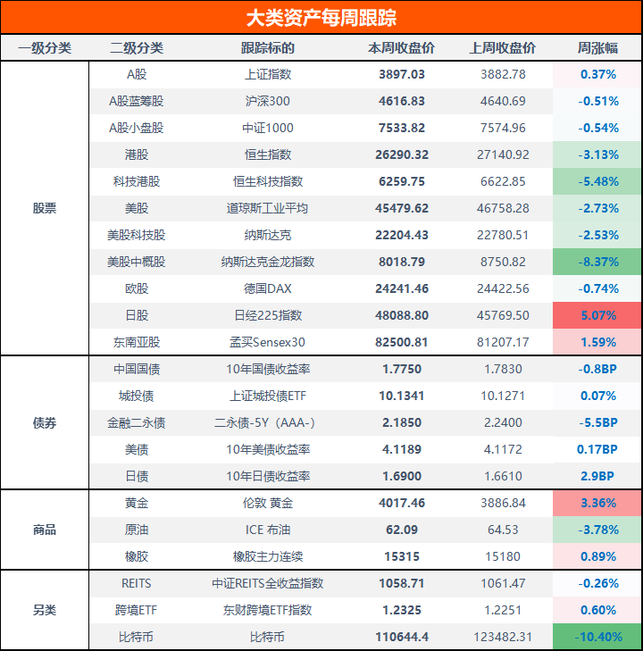 美股本周高位跳水,道琼斯指数收跌2.73%,纳斯达克指数收跌2.53%,德国DAX指数下跌0.74%;黄金上涨3.36%,站上4000美元;原油大跌3.78%,比特币跌超10%。