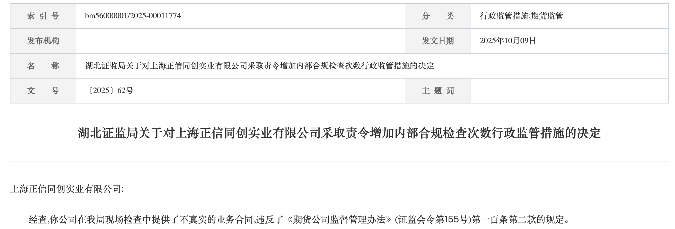 湖北证监局10月9日披露一则行政监管措施,对上海正信同创实业有限公司采取责令增加内部合规检查次数行政监管措施。