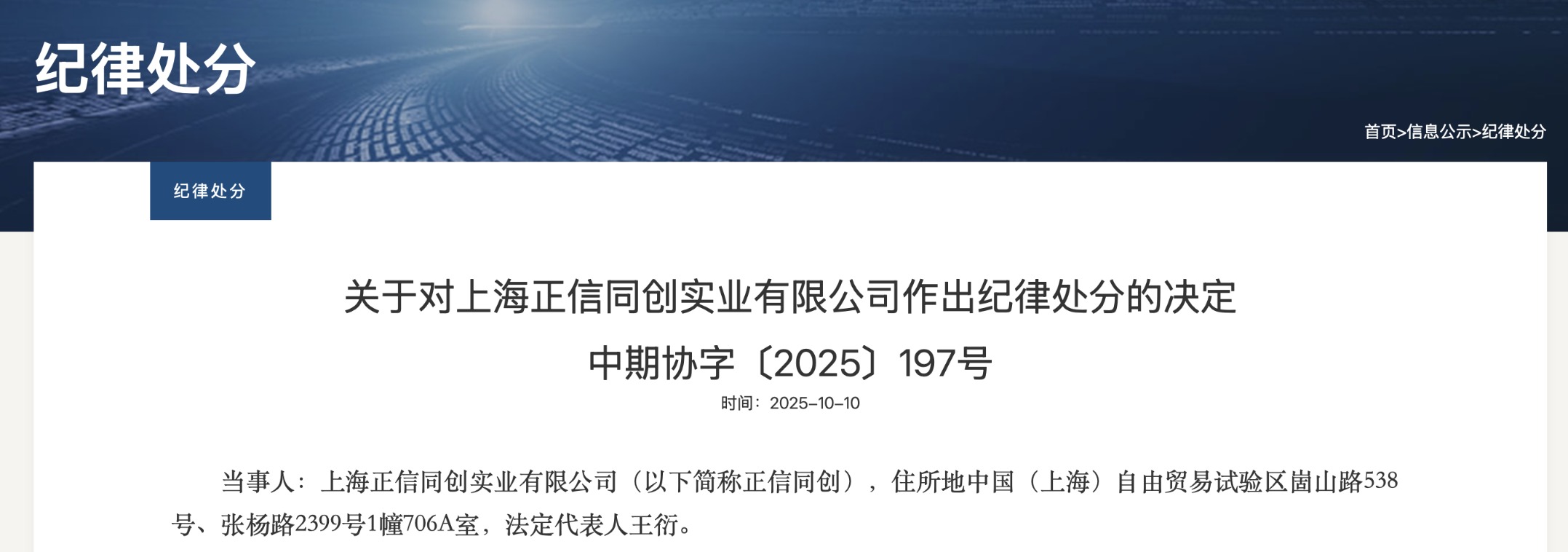 另外,中国期货业协会10月10日公告,对上海正信同创实业有限公司作出纪律处分。