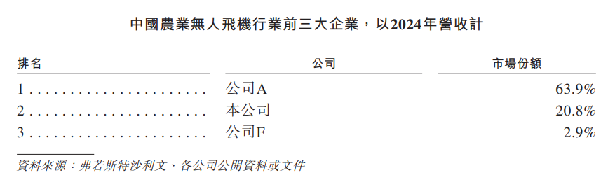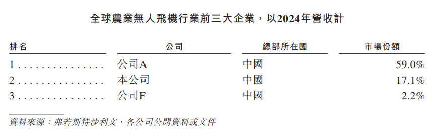 招股书显示,根据弗若斯特沙利文报告,以2024年营收计,极飞科技在全球农业无人飞机行业位于第二,市场份额为17.1%。