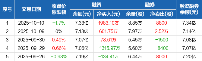 融资方面,当日融资买入4235.37万元,融资偿还2252.27万元,融资净买入1983.1万元,连续3日净买入累计2663.46万元。融券方面,融券卖出1.01万股,融券偿还1300股,融券余量8.85万股,融券余额159.03万元。融资融券余额合计7.34亿元。