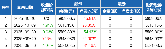 融资方面,当日融资买入523.74万元,融资偿还277.83万元,融资净买入245.91万元。融券方面,融券卖出0股,融券偿还0股,融券余量0股,融券余额0元。融资融券余额合计5859.06万元。