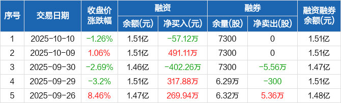 融资方面,当日融资买入814.23万元,融资偿还871.35万元,融资净偿还57.12万元。融券方面,融券卖出0股,融券偿还0股,融券余量7300股,融券余额3.43万元。融资融券余额合计1.51亿元。