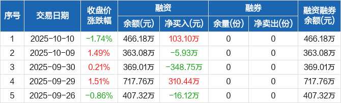 融资方面,当日融资买入320.33万元,融资偿还217.22万元,融资净买入103.1万元。融券方面,融券卖出0份,融券偿还0份,融券余量0份,融券余额0元。融资融券余额合计466.18万元。