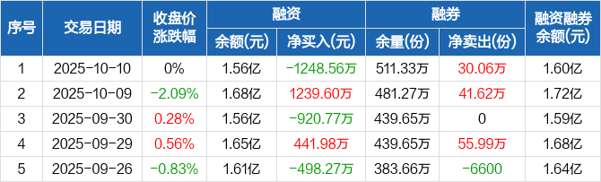融资方面,当日融资买入1811.67万元,融资偿还3060.23万元,融资净偿还1248.56万元。融券方面,融券卖出31.86万份,融券偿还1.8万份,融券余量511.33万份,融券余额359.98万元。融资融券余额合计1.6亿元。