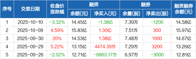 融资方面,当日融资买入3.44亿元,融资偿还4.82亿元,融资净偿还1.38亿元,净偿还额创历史新高。融券方面,融券卖出1900股,融券偿还3100股,融券余量7.39万股,融券余额1330.27万元。融资融券余额合计14.58亿元。