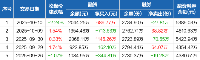 融资方面,当日融资买入927.08万元,融资偿还237.32万元,融资净买入689.77万元。融券方面,融券卖出2.29万份,融券偿还30.1万份,融券余量2734.9万份,融券余额3344.78万元。融资融券余额合计5389.03万元。