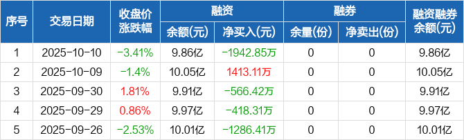 融资方面,当日融资买入2.26亿元,融资偿还2.45亿元,融资净偿还1942.85万元。融券方面,融券卖出0份,融券偿还0份,融券余量0份,融券余额0元。融资融券余额合计9.86亿元。