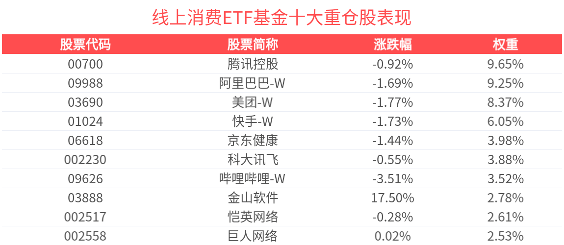 数据显示,截至2025年9月30日,中证沪港深线上消费主题指数(931481)前十大权重股分别为阿里巴巴-W(09988)、腾讯控股(00700)、快手-W(01024)、美团-W(03690)、京东健康(06618)、巨人网络(002558)、哔哩哔哩-W(09626)、科大讯飞(002230)、恺英网络(002517)、昆仑万维(300418),前十大权重股合计占比55.76%。