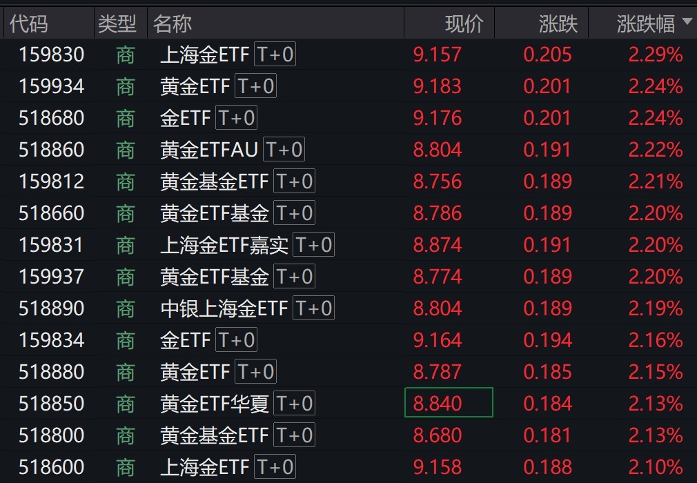 现货黄金继续冲高,商品黄金相关ETF早盘集体涨超2%
