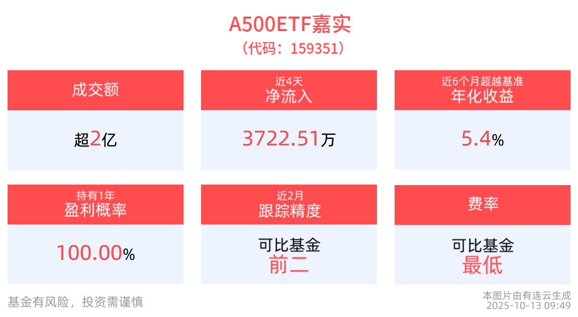 流动性方面,A500ETF嘉实盘中换手1.89%,成交2.21亿元。拉长时间看,截至10月10日,A500ETF嘉实近1年日均成交22.73亿元。