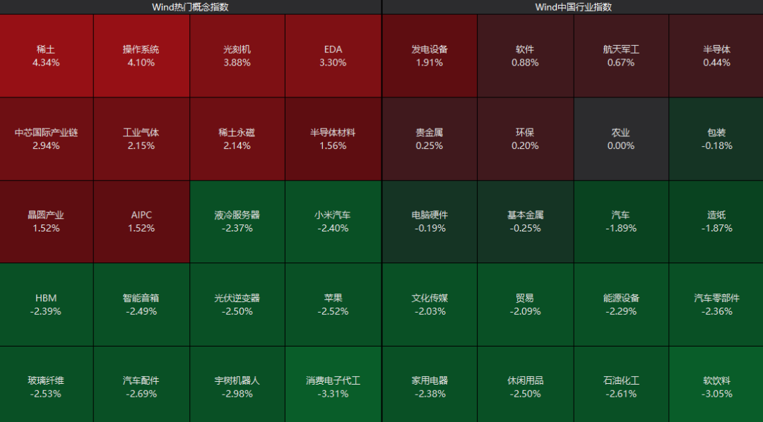 从板块来看,稀土板块强势走高,软件、航天军工、贵金属等板块表现活跃;而石油化工、机器人、消费电子等板块跌幅居前。
