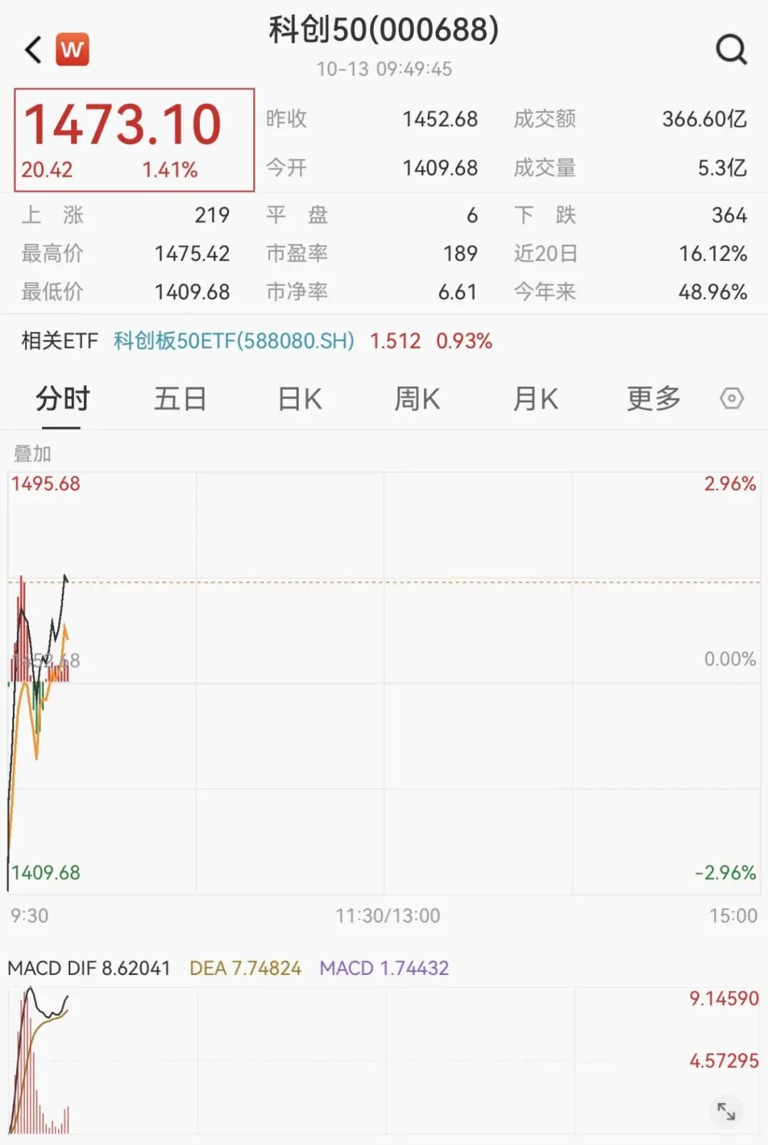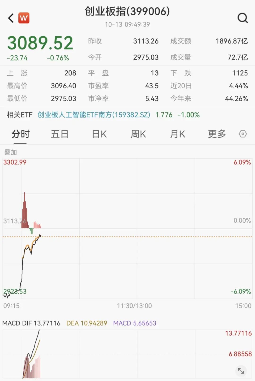 10月13日开盘,A股三大指数均大幅低开,创业板指低开4.44%,随后主要指数直线拉升,科创50指数涨超1%,早盘低开近3%;沪指、创业板指、深成指跌幅收窄。