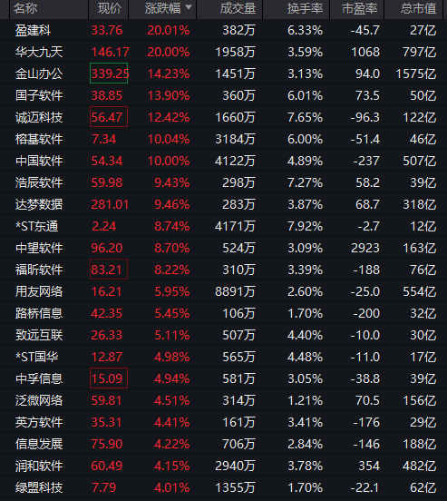 此外,自主可控产业链全线爆发,国产软件板块持续发力,盈建科、华大九天20%涨停,金山办公涨超14%,中国软件、榕基软件涨停。