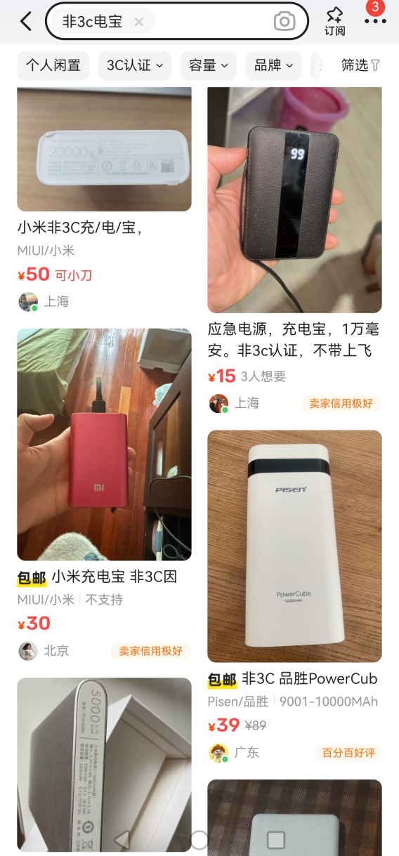而在闲鱼等二手交易平台,记者却发现仍有人将“非3C充电宝”以“二手”或“清理库存”为标签低价销售,部分卖家在页面内甚至标注“机场安检淘汰品”,价格低至十几元。