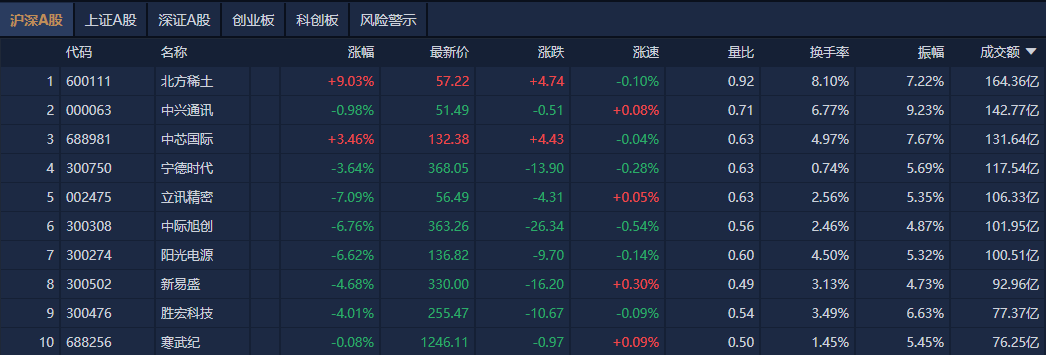 个股方面,北方稀土成交额超164亿元居首,中兴通讯、中芯国际、宁德时代成交额靠前。