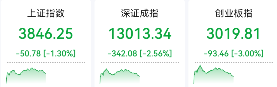 10月13日上午,A股市场低开高走,整体保持定力,但午前有所下探。截至午间收盘,上证指数报3846.25点,跌1.3%;深证成指跌2.56%,创业板指跌3%。