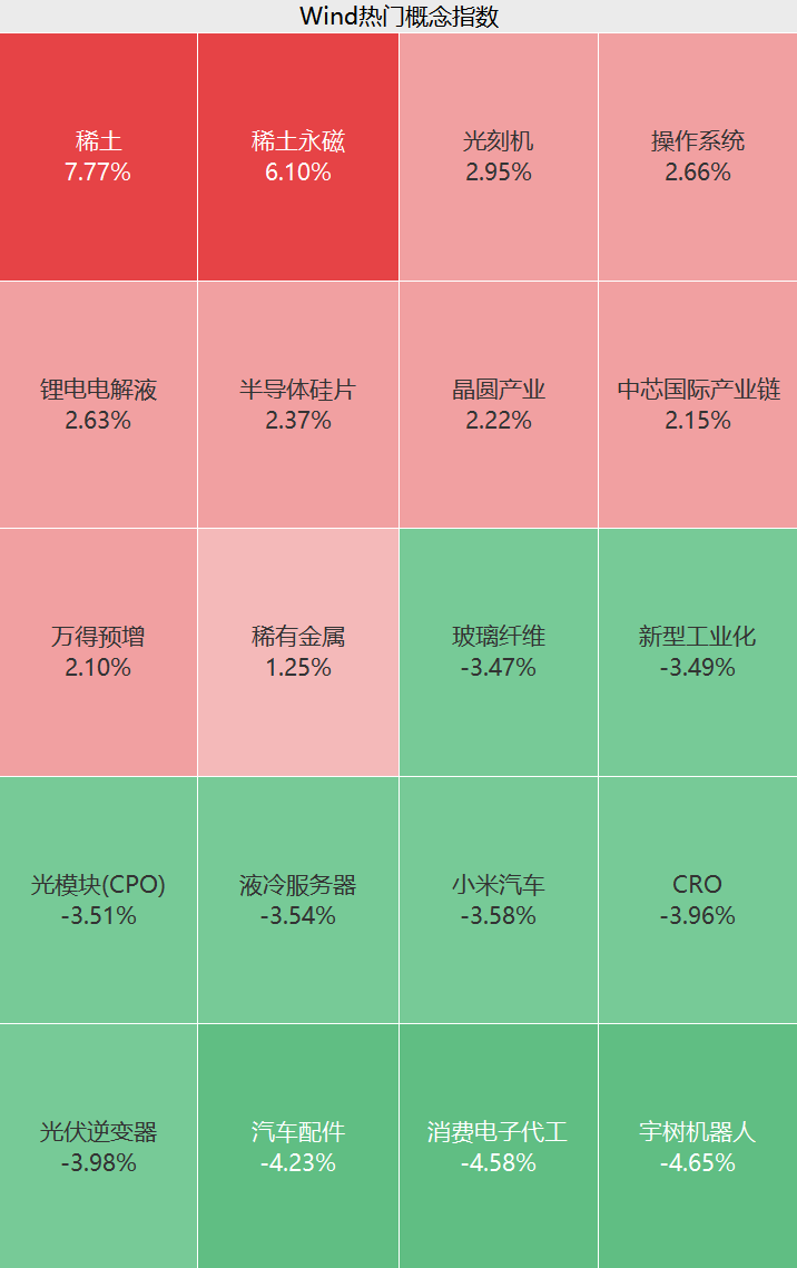 盘面上,上午航天军工、银行、海运、环保等行业板块保持上涨,稀土、光刻机、半导体、操作系统等热门概念板块走高;汽车、通信、电力设备、传媒等板块不振,宇树机器人、消费电子代工、汽车配件等概念股跌幅居前。