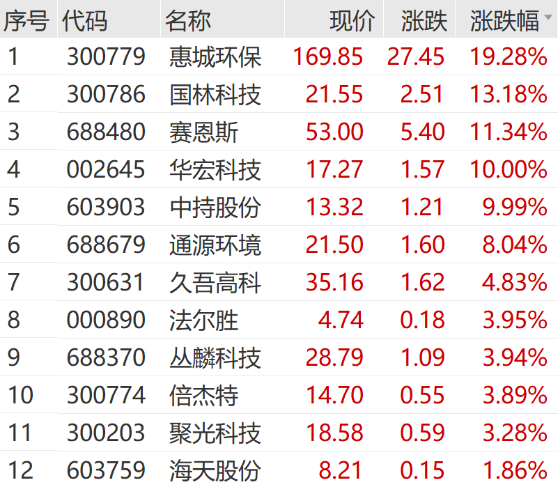 另外,上午环保板块整体走高。惠城环保盘中触及20cm涨停,华宏科技、中持股份涨停。